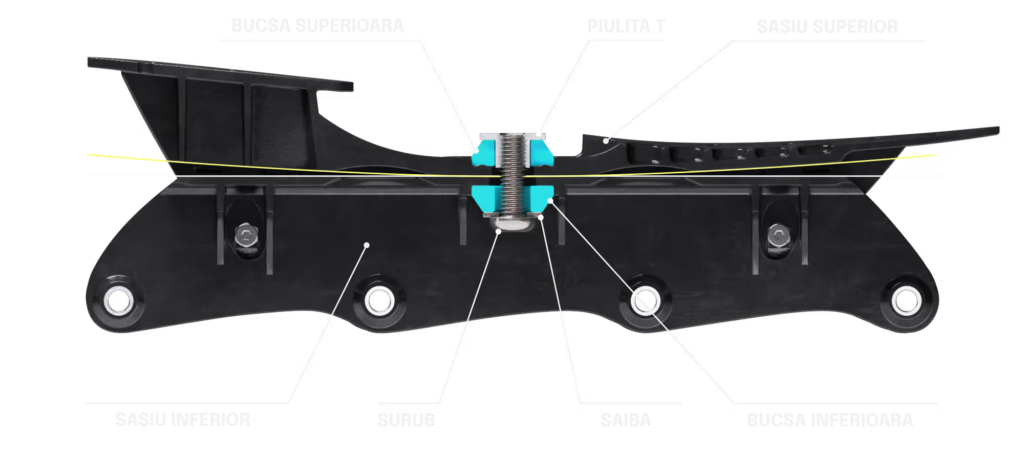 Suprafata rotunjita este suficient de instabila pentru a fi o provocare, dar ofera in continuare suficient suport pentru desprindere. Elementul care conecteaza partile sasiului consta intr-un surub, o bucsa de cauciuc amplasata pe fiecare sasiu si o piulita de blocare in T. Este plasat central pentru a oferi un brat de parghie scurt. Strangerea sau slabirea elementului surubului va permite sa ajustati nivelul de dificultate pentru a se potrivi preferintelor personale.